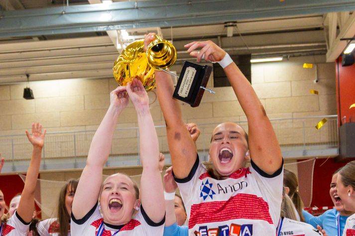 HK tryggði sér toppsætið í Grill 66 deildinni og sæti í Olís deildinni í handbolta með sigri í úrslitaleik gegn Fjölni í gærkvöldi. Heimakonur í Kórnum í Kópavogi fengu síðan gullhúðaðan bikar afhentan fyrir afrekið. Sá bikar hefur augljóslega ekki verið úr skíragulli, og líklega ekki úr neinu nema ódýru plasti. Valgerður Ýr Þorsteinsdóttir og Þórhildur Braga Þórðardóttir fengu það hlutverk að lyfta bikarnum en enduðu á því að fá hann næstum því í andlitið. Þær stóðu síðan eftir með sitt hvoran partinn, efri og neðri helminginn, af bikarnum og undirstaðan lá í gólfinu. Bikarinn í heilu lagi á leiðinni upp í loft. vísir / vilhelm Bikarinn brotnaði í fyrstu lyftu. vísir / vilhelm vísir / vilhelm Allt í rugli.vísir / vilhelm vísir / vilhelm Björgunaraðgerðir gengu illa. vísir / vilhelm