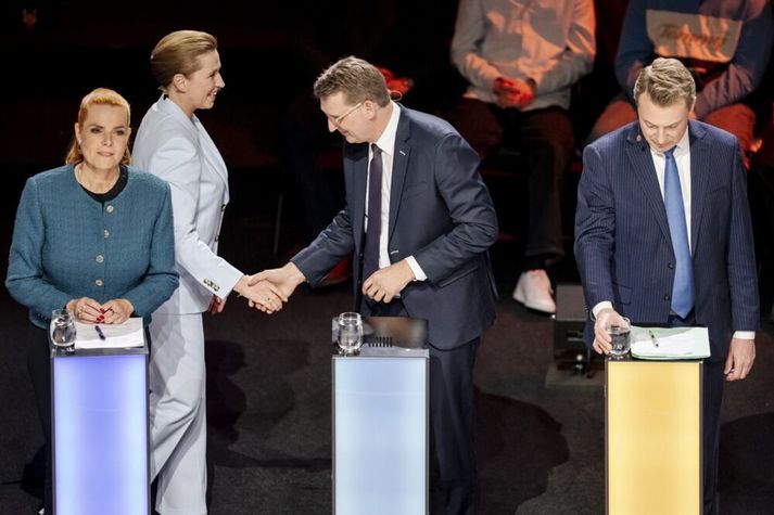 Frá sjónvrapskappræðum leiðtoga dönsku stjórnmálaflokkanna. Frá vinstri Inger Støjberg. leiðtogi Danmerkurdemókrata, Frederiksen forsætisráðherra, Troels Lund Poulsen, leiðtogi Vestre og Morten Messerschmidt, leiðtogi Danska þjóðarflokksins.Vísir/EPA
