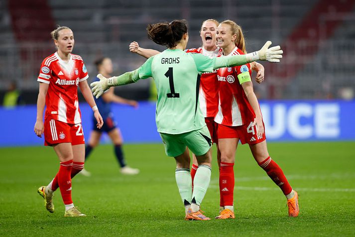 Um tímamótaleik er að ræða því kvennalið United hefur ekki áður komist svona langt í keppninni, og þá dugar ekkert minna en „Leikhús draumanna“ sem vettvangur. Liðin mætast svo aftur á Allianz Arena 1. apríl. „Þetta verður mjög sérstakt kvöld. Þetta er einstakur leikvangur með ríka sögu,“ sagði Glódís Perla fyrir leikinn í kvöld, samkvæmt Sport 1 í Þýskalandi. „Við elskum allar að spila svona stórleiki á stóru leikvöngunum, í einstöku andrúmslofti,“ bætti Glódís við. Þekkja vel framherja United Á meðal leikmanna í United-liðinu sem Glódís þarf að glíma við er þýska landsliðskonan Lea Schüller sem skipti frá Bayern til United í vetur. „Við erum allar svo glaðar að sjá hana. Hún var svo mikilvægur hluti af liðinu í langan tíma,“ sagði Glódís. Glódís Perla var hetjan þegar Bayern vann Arsenal í vetur. Nú bíður annar enskur andstæðingur.Getty/Mark Wieland Dreymir um að ná þrennunni Bayern er með ellefu stiga forskot á toppi þýsku deildarinnar, komið í undanúrslit þýska bikarsins, vann tvöfalt í Þýskalandi í fyrra og hefur orðið Þýskalandsmeistari síðustu þrjú ár í röð. Núna vill liðið hins vegar ná lengra í Meistaradeild Evrópu en fimm ár eru síðan það komst síðast í undanúrslit. „Við höfum verið alveg skýrar með það í vetur að við viljum komast lengra en síðustu ár. Næsta stóra markmið er að komast í undanúrslitin,“ sagði Glódís. Möguleikinn á að vinna stóru þrennuna, í fyrsta sinn, er til staðar: „Við eigum okkur allar þann draum að ná því en við tölum ekki mikið um það og setjum enga aukapressu á okkur, því við vitum að þessi draumur gæti orðið að veruleika ef við leggjum á okkur þá vinnu sem þarf á hverjum degi,“ sagði Glódís. Leikurinn hefst klukkan 20 í kvöld og er sýndur á Disney+.