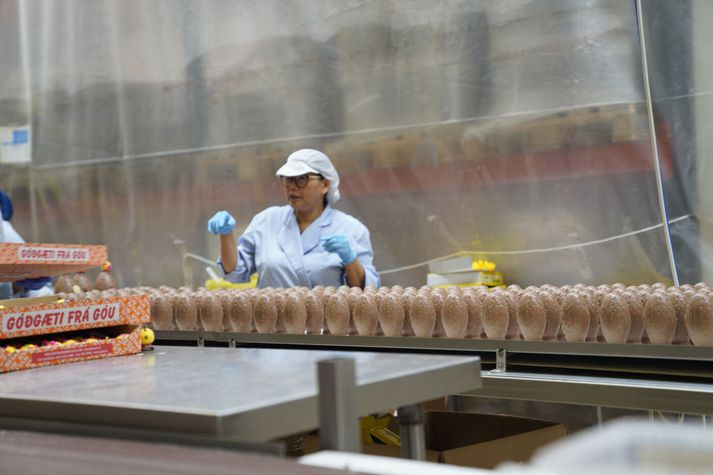 Góa framleiðir hátt í hálfa milljón eggja fyrir páskana og höfðu lokið framleiðslu þegar ákveðið var að ræsa vélarnar á nýju til að framleiða egg fyrir starfsfólk Landspítalans. Alls þurfti að bæta við sex þúsund páskaeggjum. Greint var frá því í vikunni að vegna niðurskurðar fengju starfsmenn Landspítalans engin páskaegg gefins þetta árið. Forráðamenn Góu ákváðu að grípa í taumana og gefa starfsfólkinu egg og í gær mætti Ragnar Freyr Ingvarsson, formaður læknafélags Reykjavíkur, og aðstoðaði við framleiðsluna. „Okkur finnst náttúrulega ekki nógu gott að það sé ekki verið að gefa fólki páskaegg, framlínufólkinu á spítalanum. Það er fólkið sem er að vinna vinnuna og hugsa um okkur þannig að við verðum að gefa þeim páskaeggin í ár,“ sagði Helgi Már Gíslason, framkvæmdastjóri Góu og barnabarn hins eina sanna Helga í Góu. Hann segir skemmtilega stemmningu skapast hjá fyrirtækinu þegar framleiðsla eggjana fer á fullt um áramótin. Síðustu eggin fara í verslanir á morgun og þá tekur við skemmtileg hefð starfsmanna. „Við stöndum vaktina til miðnættis í kvöld að steypa þessi egg og svo eftir hádegið á morgun þá fær allt starfsfólkið að koma og búa til sín eigin páskaegg og skreyta og koma með nýjar hugmyndir fyrir næsta ár,“ sagði Helgi í viðtali í gær. Helgi Már er framkvæmdastjóri Góu.Vísir/Lýður Valberg Starfsmenn voru í óða önn að koma sælgæti fyrir í síðustu eggjunum og skreyta. „Þetta er fyrir spítalann, við erum að byrja núna og ég held að við klárum í dag,“ segir Choosri sem unnið hefur hjá Góu í 25 ár. Hún er ekki í neinum vafa hvert sé hennar uppáhaldsegg. „Ég vil fá stórt egg,“ segir hún hlæjandi. „Fyrir strákinn minn,“ bætir hún svo við. Choosri hefur unnið í 25 ár hjá Góu og er hér á fullu að koma sælgæti fyrir inni í páskaeggjunum sem fara til starfsfólks Landspítalans.Vísir/Lýður Valberg Rúsínan í pylsuendanum eru svo páskaungarnir sem þurfa að fara á sinn stað. Fréttamaður fékk að spreyta sig í skreytingum eggjanna eins og sjá má í myndbandinu hér fyrir neðan en ólíklegt verður þó að teljast að honum verði boðin vinna við slíkt á næstunni.
