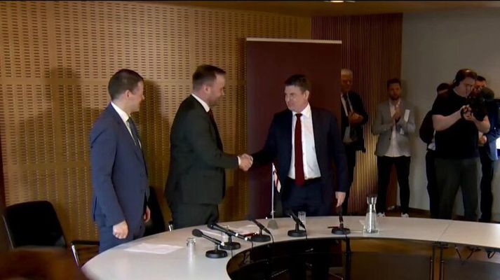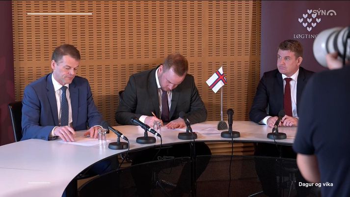 Í kvöldfréttum Sýnar mátti sjá formenn Fólkaflokksins, Sambandsflokksins og Javnaðarflokksins undirrita samstarfssáttmálann í húsakynnum Lögþingsins en Beinir Johannesen verður yngsti lögmaður í sögu Færeyja, aðeins 29 ára gamall. „Yfirskrift stjórnarsáttmála okkar er ábyrgð, staðfesta og breið sátt og við staðfestum að blokkapólitíkin heyri sögunni til,“ sagði Beinir. Oddvitarnir þrír handsöluðu síðan stjórnarsamstarfið í beinni útsendingu Kringvarpsins. Samstarfssáttmálinn undirritaður. Frá vinstri: Bárður á Steig Nielsen, Beinir Johannesen og Aksel V. Johannesen, en Aksel er föðurbróðir Beinis.Kringvarpið Athygli vekur að Javnaðarflokkurinn skuli velja samstarf við tvo hægri flokka í stjórn sem telja má mið-hægristjórn. „Færeysk stjórnmál þurfa bæði á sáttmálum og breiðri sátt að halda og þess vegna ákváðum við að ganga inn í þetta samstarf,“ sagði Aksel V. Johannesen, formaður Javnaðarflokksins og fráfarandi lögmaður. „Þetta er auðvitað samstarf milli þriggja stórra flokka og af þeim eru tveir borgaralegir flokkar. Og þess vegna er það okkar verkefni að draga þá aðeins til vinstri. Það held ég að hafi tekist, eins og sjá má í stjórnarsáttmálanum,“ sagði Aksel. Aksel V. Johannesen, formaður Javnaðarflokksins og fráfarandi lögmaður, sagði verkefni síns flokks að draga samstarfsflokkana til vinstri.Kringvarpið Og nýja stjórnin stefnir á meiri olíuleit við Færeyjar. „Við teljum að ekki sé bara um að ræða annað hvort græna orku eða svarta orku, heldur hvorttveggja. Því viljum við hvetja til þess að hafin verði olíuvinnsla í Færeyjum,“ sagði Beinir. Með Sambandsflokkinn innanborðs var fyrirfram ljóst að ríkjasambandinu við Danmörku yrði ekki slitið. Engu að síður ætlar stjórnin að óska eftir meiri áhrifum, einkum í utanríkis- og varnarmálum. Flokksformennirnir handsala samstarfið.Kringvarpið „Við erum því samhuga um að hefja samningaviðræður við dönsku ríkisstjórnina um að fá heimildir til að sækja um aðild að þeim alþjóðastofnunum sem við viljum og geta þar með sinnt hagsmunagæslu úti í heimi. Og sömuleiðis að Færeyjar hafi sjálfsákvörðunarrétt í öllum málum sem viðkoma Færeyjum,“ sagði Beinir Johannesen, verðandi lögmaður Færeyja, eins og heyra má hér í sjónvarpsfrétt Sýnar: