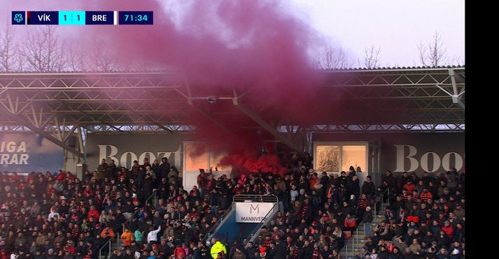 Kveikt var á blysum á fyrsta leik tímabilsins, þegar Víkingur og Breiðablik mættust í Víkinni. Samkvæmt niðurstöðu aga- og úrskurðarnefndar KSÍ voru það stuðningsmenn Víkings sem kveiktu á blysum fyrir leik og þegar Gylfi Þór Sigurðsson jafnaði metin í leiknum. Reykurinn frá blysum á leik Víkings og Breiðabliks sást vel í sjónvarpsútsendingu.Sýn Sport Þá er þess getið að stuðningsmenn Víkings hafi ítrekað kallað „KSÍ-mafía“ inn á völlinn og hefur það einnig áhrif á sektarupphæðina sem eins og fyrr segir var 150.000 krónur í þessu tilfelli. Blysin á upphafsleik Bestu deildarinnar höfðu sín áhrif á útsýnið um stundarkorn.vísir/Anton Stuðningsmenn Þórs kveiktu svo í fleiri blysum, eða minnst fjórum, á Hlíðarenda þar sem þeir fögnuðu fræknum sigri gegn Val í fyrsta leik Þórs í efstu deild síðan árið 2014. Þór fékk sekt upp á 250.000 krónur vegna þessa en hámarks sektarupphæð félaga, þegar áhorfendur gerast sekir um vítaverða eða hættulega framkomu, er 500.000 krónur.