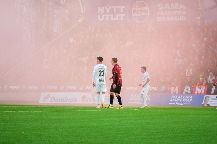 Stuðningsmenn kosta Þór og Víking hundruð þúsunda Sindri Sverrisson skrifar 16. apríl 2026 17:15 Stuðningsmenn Þórs höfðu góða ástæðu til að kætast á langþráðum leik í Bestu deildinni. Blysin þeirra kosta félagið hins vegar skildinginn. vísir/Guðmundur Knattspyrnudeild Þórs þarf að greiða 250.000 króna sekt til KSÍ, og knattspyrnudeild Víkins 150.000 króna sekt, vegna stuðningsmanna sem kveiktu á blysum í fyrstu umferð Bestu deildar karla í fótbolta. Kveikt var á blysum á fyrsta leik tímabilsins, þegar Víkingur og Breiðablik mættust í Víkinni. Samkvæmt niðurstöðu aga- og úrskurðarnefndar KSÍ voru það stuðningsmenn Víkings sem kveiktu á blysum fyrir leik og þegar Gylfi Þór Sigurðsson jafnaði metin í leiknum. Reykurinn frá blysum á leik Víkings og Breiðabliks sást vel í sjónvarpsútsendingu.Sýn Sport Þá er þess getið að stuðningsmenn Víkings hafi ítrekað kallað „KSÍ-mafía“ inn á völlinn og hefur það einnig áhrif á sektarupphæðina sem eins og fyrr segir var 150.000 krónur í þessu tilfelli. Blysin á upphafsleik Bestu deildarinnar höfðu sín áhrif á útsýnið um stundarkorn.vísir/Anton Stuðningsmenn Þórs kveiktu svo í fleiri blysum, eða minnst fjórum, á Hlíðarenda þar sem þeir fögnuðu fræknum sigri gegn Val í fyrsta leik Þórs í efstu deild síðan árið 2014. Þór fékk sekt upp á 250.000 krónur vegna þessa en hámarks sektarupphæð félaga, þegar áhorfendur gerast sekir um vítaverða eða hættulega framkomu, er 500.000 krónur. Besta deild karla Víkingur Reykjavík Þór Akureyri Mest lesið Fyrrum markmaður Arsenal og Juventus lést í bílslysi Fótbolti Eiður Smári með eldræðu um Chelsea: „Ég hefði ekki sofið í fjóra daga“ Enski boltinn Oddaleikurinn færður vegna árshátíðar Körfubolti „Þú ert farinn að verða þybbinn“ Fótbolti Gervigreindin gaf Alberti engan séns hjá Bayern Fótbolti LIV heldur sínu striki í miðjum stormi Golf „Ég get ekki breytt þessu“ Íslenski boltinn Stuðningsmenn kosta Þór og Víking hundruð þúsunda Íslenski boltinn Launin ekki aðalatriði og bónus að hafa fjölskylduna nálægt Íslenski boltinn Gabríel Snær seldur til Svíþjóðar Íslenski boltinn Fleiri fréttir Stuðningsmenn kosta Þór og Víking hundruð þúsunda Gabríel Snær seldur til Svíþjóðar Launin ekki aðalatriði og bónus að hafa fjölskylduna nálægt „Ég get ekki breytt þessu“ Oliver keyptur til KA „Hleyp jafn hratt og Mikael“ Arnar sleit sin í hné og bíður svara varðandi framhaldið Hjartað brotið, hent eins og hverri annarri kúkableyju Ekki tapað fyrir Keflavík í 24 leikjum í röð „Þetta er bara löglegt mark sem er tekið af KA“ Segir ekkert vit í afsökunum Valsmanna Sjáðu öll mörkin úr fyrstu umferð Bestu deildarinnar „Dreymdi að ég myndi skora tvö“ „Ef hann lítur á þetta sem leikaraskap þá er hann á rangri hillu“ Uppgjörið: Fram - ÍA 3-3 | Chopart bjargaði stigi eftir rússibanareið Uppgjörið: KA - Stjarnan 2-3 | Flugu heim með stigin þrjú eftir fjörugan leik „Gáfum ódýr mörk“ „Frammistaðan verðskuldaði klárlega stig“ Áttu flug beint eftir leik og komust ekki í viðtöl „Sviðskvíðinn hvarf aldrei hjá lærisveinum mínum“ „Fannst þeir ekki eiga séns í okkur hérna í seinni hálfleik“ Uppgjörið: Valur - Þór Ak. 1-2| Nýliðarnir sóttu þrjú stig á Hlíðarenda Uppgjörið: KR - Keflavík 3-2 | Alexander Rafn fullkomnaði endurkomu KR-liðsins Uppgjörið: ÍBV - FH 1-1 | Tryggði stig í fyrsta leik „Deildin aldrei verið sterkari en í ár“ Bikarmeistararnir áfram eftir danskt sigurmark í lokin „Ekki gott fyrir hin liðin“ „Verður þetta ekki bara geðveiki?“ Segir að Ekroth verði að gera betur Víkingar áttu að fá víti: „Þetta er hendi, það er bara klárt“ Sjá meira