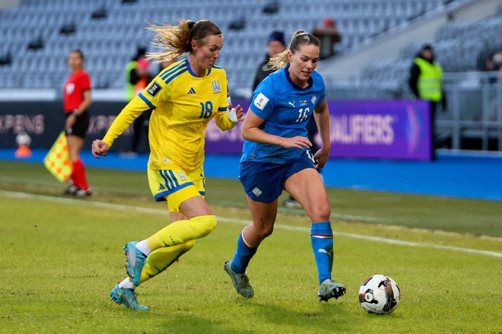 Ísland vann sterkan 1-0 sigur gegn Úkraínu fyrr í vikunni en nú er komið að Evrópumeisturum Englands, einu besta landsliði heims. Sá leikur verður væntanlega aðeins öðruvísi. „Við gerum bara ráð fyrir því að við munum þurfa að verjast meira á móti Englandi. Mitt hlutverk verður bara að stríða miðjumönnunum, ýta í þær og trufla þær,“ sagði Hildur. England vann fyrri leik liðanna 2-0 en bæði mörkin komu eftir fyrirgjafir. Hildur segir Ísland þurfa að passa betur upp á það í dag. „Þær leita rosalega mikið upp kantana og fara í yfirtölu þar. Þær skora bara lang flest mörkin sín þar. Við þurfum að hafa gætur á því og passa að manna teiginn rétt. Koma í veg fyrir þessar fyrirgjafir en auðvitað munu einhverjar fyrirgjafir koma og þá þurfum við bara að vera tilbúnar.“ Laugardalsvöllurinn er ekki upp á sitt allra besta þessa dagana eftir vont veðurfar í apríl en Hildur kvartar ekki. „Völlurinn var allt í lagi. Við áttum kannski aðeins erfitt með að fóta okkur og finna sendingar en hitt liðið lendir svosem í því líka, þannig að þetta er bara jafn erfitt fyrir bæði lið.“ Hildur í átökum gegn Úkraínu. VÍSIR Þetta hindrar Englendinga kannski í þeirra uppspili upp kantinn? „Já og nei. Boltinn rennur rosalega hratt, sem er gott fyrir þær, en það verður bara skemmtilegt að díla við þetta.“ Klippa: Hildur ræðir landsleikinn við England